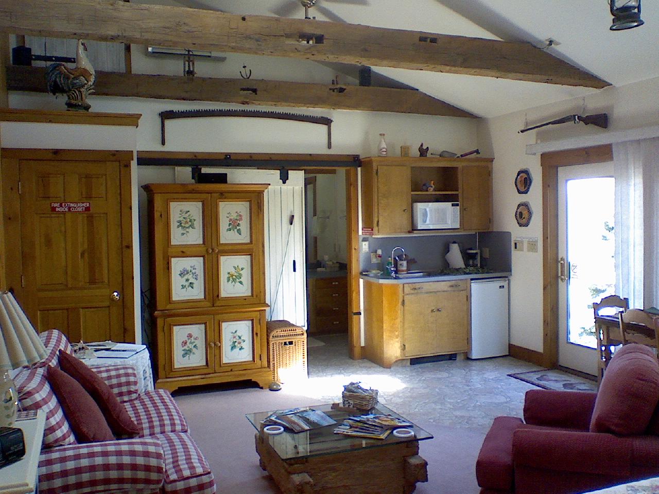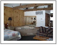 The Stable Built in the latter half of 2002, the Stable is the newest guest room at Hillside Farm. It also is designed as a romantic hide-a-way for two and includes all of the same amenities as the Chicken Coop, but does it with a different flair. It has been described as "more masculine" by virtue of the leather furniture and the ceiling-high stone fireplace. The spectacular view of the "neigh"bor's horses appears to bring them right into the room. The Stable is only marginally larger, but the full cathedral ceiling and different layout give the illusion of more roominess. The Stable contains a king bed, a shower for two, wet bar, refrigerator, microwave, gas fireplace, air conditioner, three- corner airjet tub, and entertainment center. This unit incorporates a horse barn theme and is decorated with rich dark colors that contrast with the expansive windows and walls made of natural yellow knotty pine barn siding . The Stable replaces an old shed at the rear of the property once used to house equipment and/or animals in the past. The location provides as much seclusion as any romantic setting could possibly want (the horses won't tell what they see). The format for breakfast is the same as the Coop; enjoy a piping hot country breakfast at the antique kitchen table. Rates: Holidays and weekends are a Two-night minimum