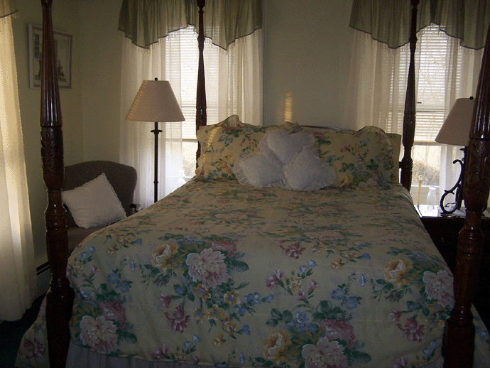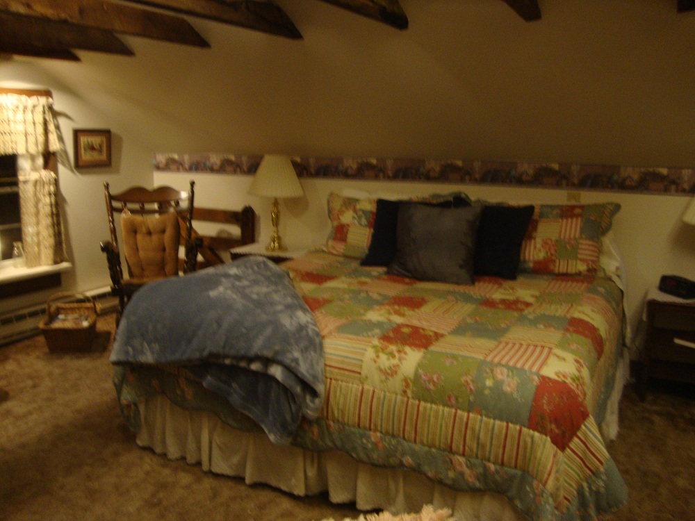The Loft Our largest and quietest room, on the third floor, is fast becoming a favorite of couples looking for a romantic getaway on a budget. The room has a raised ceiling with exposed beams, window AC (seasonal), paddle fan and separate heat. This cozy room is furnished with a king bed, love seat (full sleeper), overstuffed rocker and bedroom rocker, fireplace, flat screen TV/VCR/DVD, refrigerator and hotpot. The private bath has no tub, only a shower stall. The Loft can accommodate 2. Rate $125-$145 + tax for 2 per night